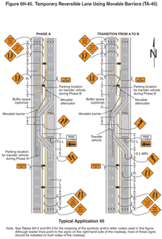 Figure 6H-45 Temporary Reversible Lane Using Movable Barriers (TA-45)